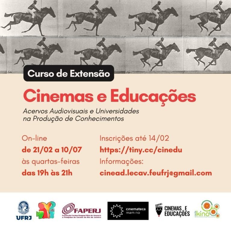 Estão abertas as inscrições para o Curso de Extensão “Cinemas e Educações” desenvolvido pelo Cinead/LECAV (UFRJ). Serão 20 encontros on-line para discutir diferentes vínculos entre cinemas e educações, do cinematógrafo à inteligência artificial.Estão abertas as inscrições para o Curso de Extensão “Cinemas e Educações” desenvolvido pelo Cinead/LECAV (UFRJ). Serão 20 encontros on-line para discutir diferentes vínculos entre cinemas e educações, do cinematógrafo à inteligência artificial.